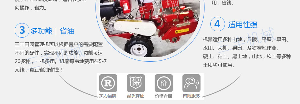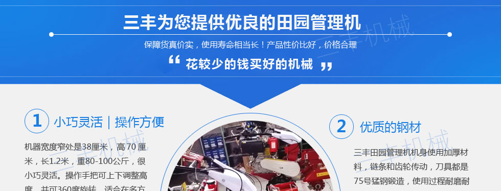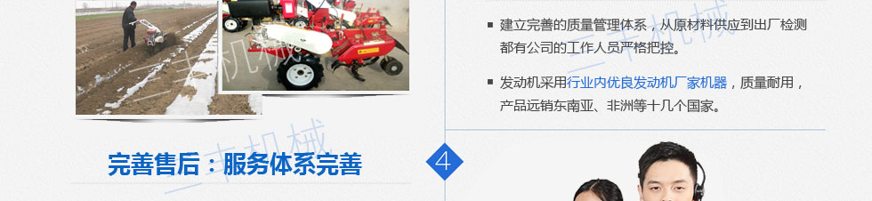 服務(wù)周到,不多花一分錢,細致周到的服務(wù)和可靠的信譽贏得客戶。田園管理機產(chǎn)品的各項指標已 達到國內(nèi)外同類產(chǎn)品的先進水平。